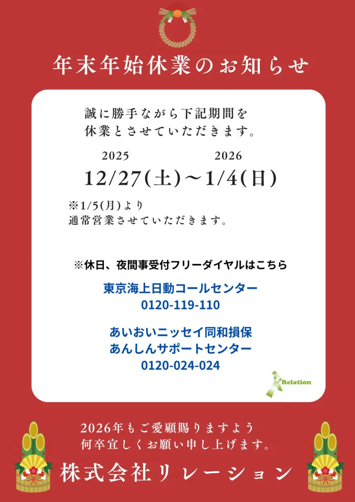 年末年始休業のお知らせ 2025-12-23 最終更新日時 : 2025-12-23 リレーション2025年も、多くの皆様と素敵なご縁に恵まれ、心より感謝しております。2026年が皆様にとって素晴らしい一年になりますように。株式会社リレーション一同